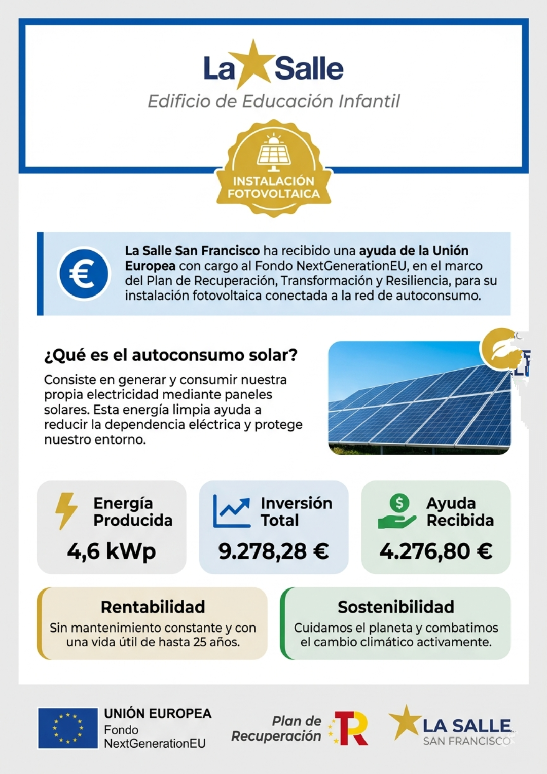 En nuestro colegio dimos un paso importante hacia la sostenibilidad con la instalación, hace ya un tiempo, de placas solares en el edificio de Infantil. Esta iniciativa refleja nuestro compromiso con el cuidado del medio ambiente y la educación en valores responsables. Apostar por energías renovables, como la solar, nos permite reducir nuestra huella ecológica y aprovechar los recursos naturales de forma eficiente. Además, este proyecto sirve como ejemplo práctico para nuestro alumnado de todas las etapas, desde Infantil hasta Secundaria. Queremos que nuestro centro sea un espacio más respetuoso con el entorno y consciente del futuro del planeta. Con acciones como esta, avanzamos hacia un colegio más sostenible y comprometido.